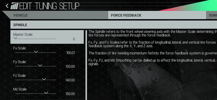 Mz Scale: タイヤの向きに関係するフォース。ハンドルを直進に戻そうとする力や、滑った時に軽くなる等の調整。