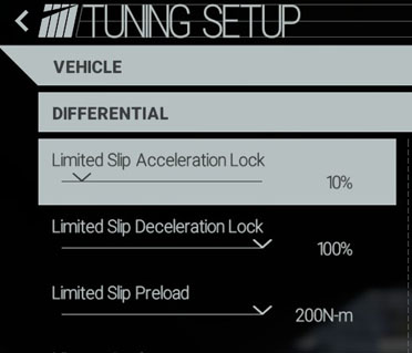 デフはLimited Slip Acceleration Lockが10で他は最弱にする)